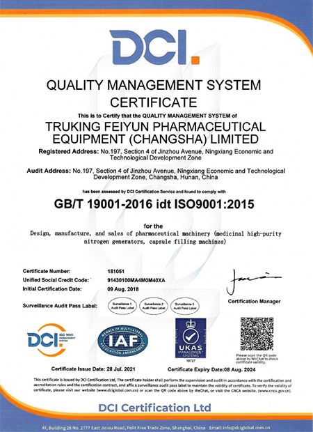 Como vicepresidente de la Asociación de la Industria Farmacéutica de China, Truking Feiyun ha participado en el desarrollo y revisión de los estándares nacionales para el generador de nitrógeno de alta pureza médica, la llenadora de cápsulas duras totalmente automática y el pulidor clasificador de cápsulas. La brecha entre los mercados nacionales e internacionales ha sido ocupada por una serie de equipos farmacéuticos de Truking Feiyun, por lo que no se sorprenda de encontrar nuestros equipos farmacéuticos en diversos países, somos un proveedor confiable, trabajamos con mucha honestidad y sobretodo con miras a cooperación a largo plazo. Nuestra llenadora de cápsulas duras totalmente automática NJP7200 está a la vanguardia de la tecnología y la capacidad, ha sido designada como "Proyecto Especial de Modernización de la Medicina Tradicional China en la Provincia de Zhejiang" por la Comisión económica y de tecnología de la información de Zhejiang. Además, muchos otros equipos farmacéuticos, entre los que se incluyen el llenador de cápsulas de contención, el mezclador granulador, la envasadora y pesadora de cápsulas, la contadora de tabletas y la envasadora de productos viscosos, han ganado el "Premio al Progreso Científico y Tecnológico" prescrito por la Asociación de la Industria Farmacéutica de China (CPIA), el rendimiento técnico de estos equipos ha superado los estándares de la industria.